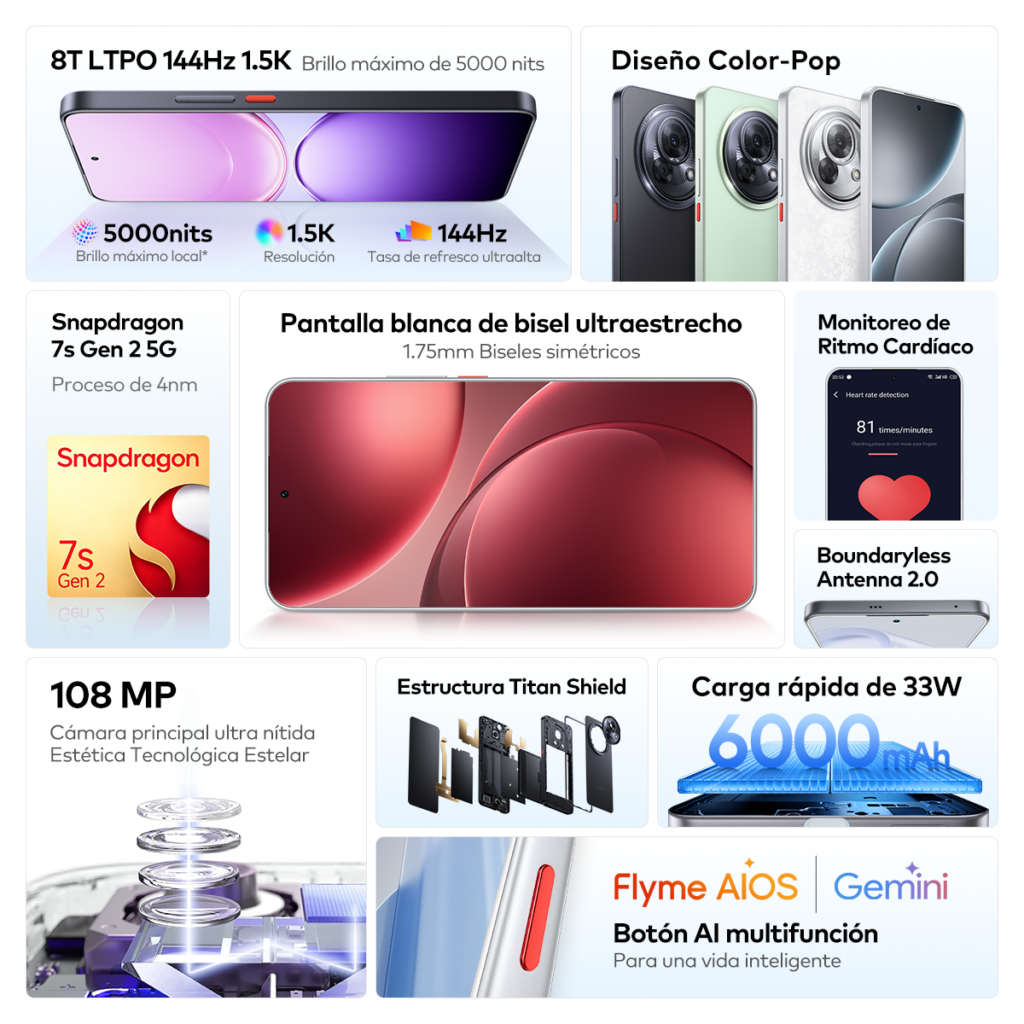 Como un dispositivo dirigido al segmento medio, el Meizu Lucky 08 combina un diseño diferenciado con un rendimiento sólido. Está impulsado por el procesador Snapdragon 7s Gen 2 de segunda generación, fabricado con un proceso avanzado de 4 nm que mejora la eficiencia energética sin comprometer el rendimiento. Además, ofrece configuraciones de hasta 12 GB de RAM y 512 GB de almacenamiento, más que suficiente para las necesidades diarias de los usuarios.
